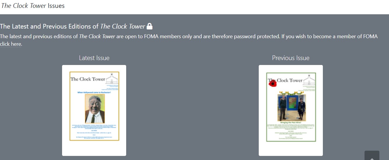 The Friends of the Medway Archive (FOMA) operates as an independent organisation with a constitution and a committee. The Society lends its support to the Centre by helping with Centre activities but also by organising their own events, fundraising, promotion and research. FOMA has its own website which includes an index of Medway men who fought and died in the First World War. It publishes a quarterly journal, The Clock Tower, which includes articles about Medway local history, forthcoming events and letters. Articles are written by Society members, staff of Medway Archives and other organisations with a local interest. Past journals, the FOMA De Caville Index and other information can be accessed via their recently upgraded website: http://foma-lsc.org
