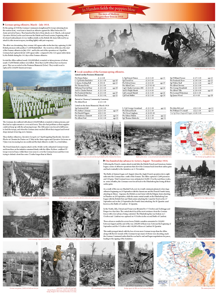 I was not involved with collating the FOMA De Caville Index of Medway’s First World War casualties, but once it was launched in 2014 and Norma asked the FOMA committee if we could stage exhibitions based on the casualties, I finished up working with the then FOMA chairman producing an exhibition each year, from 2014 to 2018 inclusive, highlighting the men who lost their lives and the First World War events in which they were involved. Much of the content of these can be seen on the FOMA website. This led to involvement with Medway Councils 1918-2018 Heritage Lottery Project Soldiers Stories on Our Streets, where I again went into primary schools along with the Guildhall Museum education team.